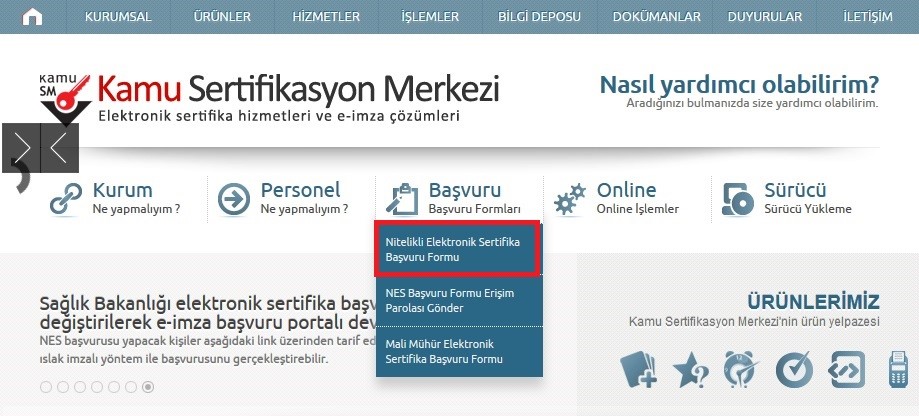 - Gelen parola ile kişi http://www.kamusm.gov.tr/ adresinden "Nitelikli Elektronik Sertifika Başvuru Formu" seçilir. (Örnek görsel aşağıdadır)