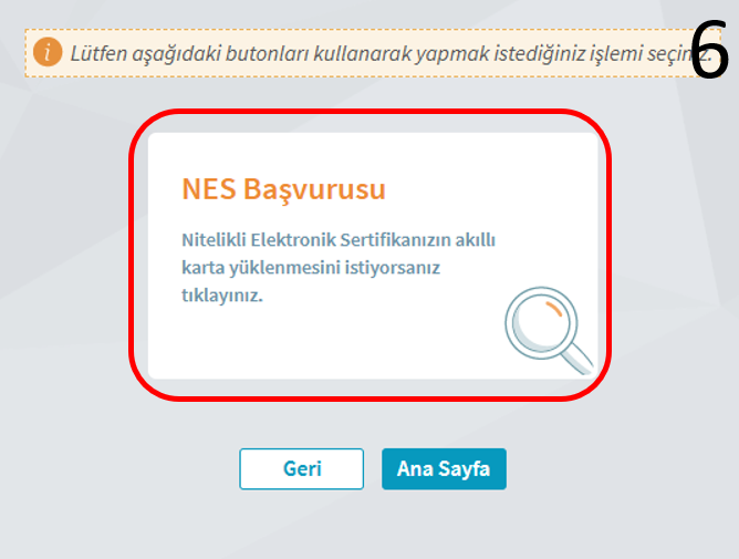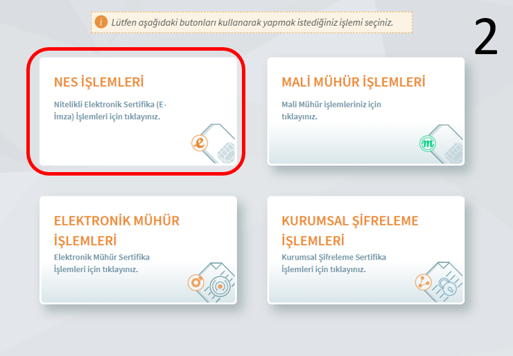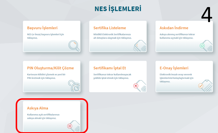 - Kayıp/Çalıntı durumlarında ilk önce KAMU SM Online İşlemler sayfasından NES İşlemleri -> Bireysel İşlemler -> Sertifikamı İptal Et / Askıya Alma adımları takip edilerek sertifika kullanıma kapatılır.